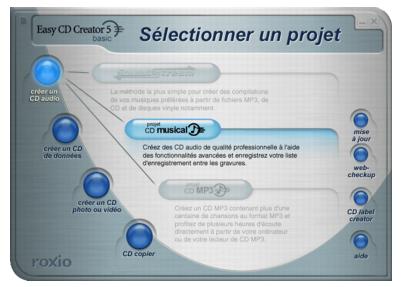 - Sur la barre des tâches de Windows, cliquez sur Démarrer, pointez sur Programmes, pointez sur Roxio Easy CD Creator 5 et sélectionnez Project Selector.