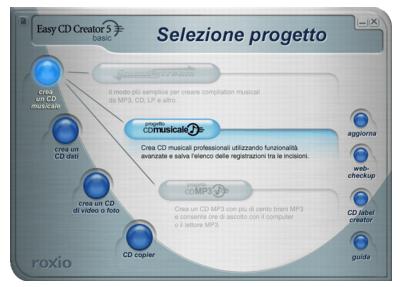 - Sulla barra delle applicazioni di Windows, fare clic sul pulsante Start, selezionare Programmi, Roxio Easy CD Creator 5, quindi selezionare Project Selector.