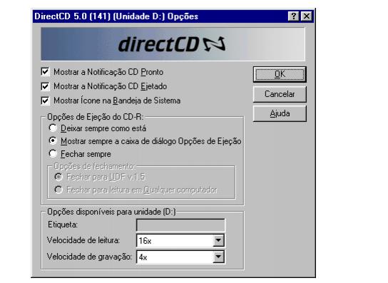 - Opções: Exibe a caixa de diálogo Opções, onde você pode alterar as opções do DirectCD. Consulte Alterando opções do DirectCD.