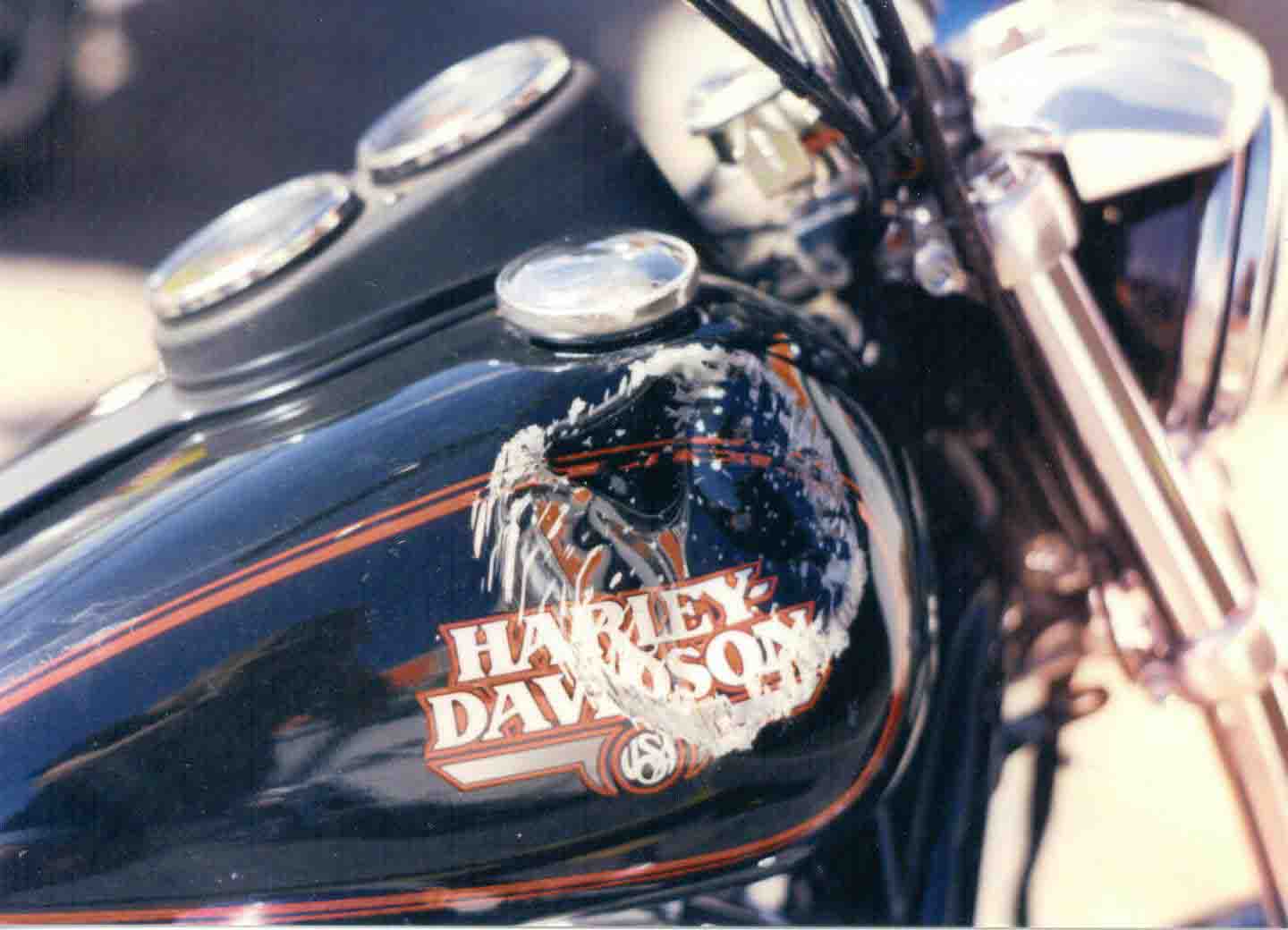April 15, 1991 a person we shall call "moron" pulled out in front of me causing damage to my beloved.  As luck would have it, the accident occured less than 2 miles from the Harley shop.  Once I saw that the tow guy (we'll call him "moron #2") was going to wrap a chain around Carley (that's her name), I decided to shake off my minor injuries and ride her to the shop myself.  The looks on the employee's faces as I pulled into the parking lot were pretty funny.  I still have the dented front wheel if anyone needs a good 21" tire and hub.  I remember Carley had 33,002 miles on the odometer the day of the wreck.  Note the turn signal still works...that's quality!  Here are some pictures.  (Click on any image to enlarge)