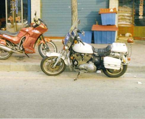 Yep...you guessed it; In a city with a half dozen auto factories and just as many motorcycle factories, the chosen steed of the Korean Police Department is Harley-Davidson. I've never seen a police Sportster before or since.